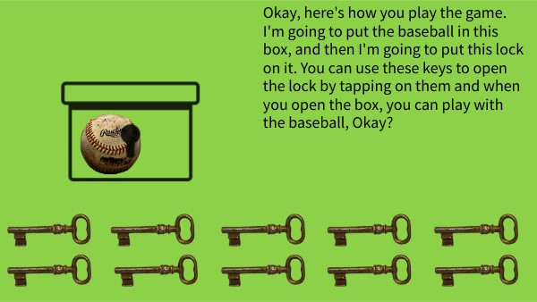 Okay, here's how you play the game. I'm going to put the baseball in this box, and then I'm going to put this lock on it. You can use these keys to open the lock by tapping on them and when you open the box, you can play with the baseball, Okay?