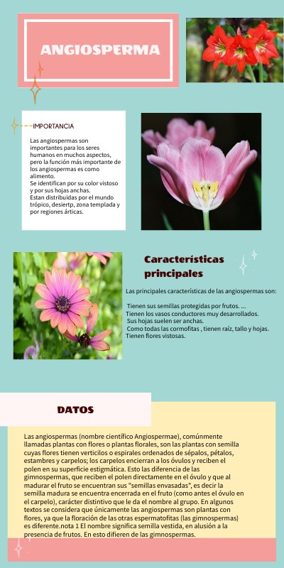 Las angiospermas son importantes para los seres humanos en muchos aspectos, pero la función más importante de los angiospermas es como alimento.Se identifican por su color vistoso y por sus hojas anchas. Estan distribuidas por el mundo trópico, desiertp, zona templada y por regiones árticas.