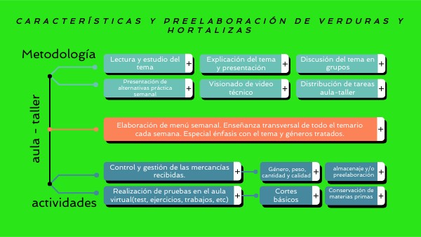 Vamos a distribuir las tareas de preelaboración de hortalizas y verduras en el aula taller para esta semana. Pongamos en práctica lo aprendido.