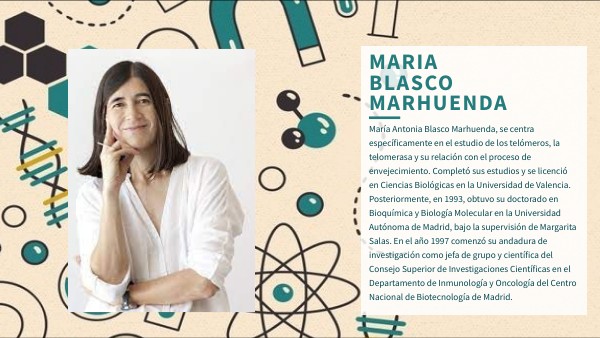 María Antonia Blasco Marhuenda, se centra específicamente en el estudio de los telómeros, la telomerasa y su relación con el proceso de envejecimiento. Completó sus estudios y se licenció en Ciencias Biológicas en la Universidad de Valencia. Posteriormente, en 1993, obtuvo su doctorado en Bioquímica y Biología Molecular en la Universidad Autónoma de Madrid, bajo la supervisión de Margarita Salas. En el año 1997 comenzó su andadura de investigación como jefa de grupo y científica del Consejo Superior de Investigaciones Científicas en el Departamento de Inmunología y Oncología del Centro Nacional de Biotecnología de Madrid.