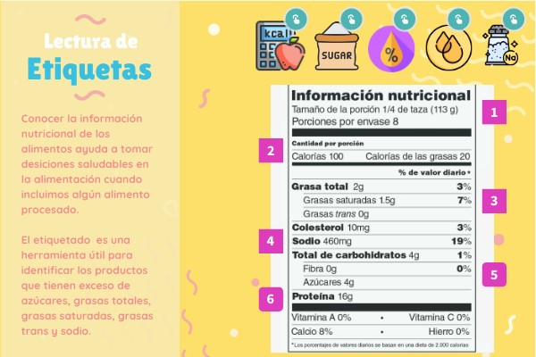 Conocer la información nutricional de los alimentos ayuda a tomar desiciones saludables en la alimentación cuando incluimos algún alimento procesado. El etiquetado es una herramienta útil para identificar los productos que tienen exceso de azúcares, grasas totales, grasas saturadas, grasas trans y sodio.
