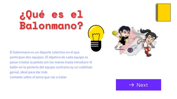 El balonmano es un deporte colectivo en el que participan dos equipos. El objetivo de cada equipo es pasar o botar la pelota con las manos hasta introducir el balón en la portería del equipo contrario.oy un subtítulo genial, ideal para dar máscontexto sobre el tema que vas a tratar