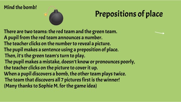 Mind the bomb! There are two teams: the red team and the green team. A pupil from the red team announces a number. The teacher clicks on the number to reveal a picture. The pupil makes a sentence using a preposition of place. Then, it's the green team's turn to play. The pupil makes a mistake, doesn't know or pronounces poorly, the teacher clicks on the picture to cover it up. When a pupil discovers a bomb, the other team plays twice. The team that discovers all 7 pictures first is the winner! (Many thanks to Sophie M. for the game idea)
