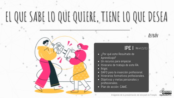 ¿Qué tal si nos paramos un momento a pensar sobre nosotros/as mismos/as y lo que queremos hacer en un futuro? Sí, sí... ya sé que me he puesto muy "reflexiva" pero a estas alturas creo que ha llegado el momento de hacerlo 🤔, ¿no crees? Tener claro a qué te quieres dedicar exactamente dentro de tu sector profesional; identificar un objetivo profesional que sea acorde con tus intereses, tus motivaciones y tus destrezas; diseñar un plan de acción que te ayude a conseguir tus objetivos... son aspectos muy importantes que tienes que trabajar y tener en cuenta en el diseño de tu Itinerario Personal para la Empleabilidad. Por eso, vamos a dedicar este Resultado de Aprendizaje a que analices y evalúes tu potencial profesional y tus intereses: para que te sirva de guía a la hora de elaborar tu hoja de ruta para tu inserción profesional en base al análisis de tus competencias, intereses y destrezas personales. En definitiva vamos a crear un proyecto así que... ágarrate que vienen curvas, ¡voy a proponerte sacar tu lado más emprendedor! 🏎️