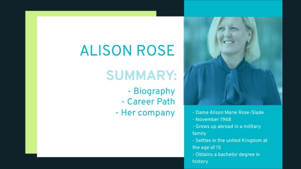 - Dame Alison Marie Rose-Slade - November 1968 - Grows up abroad in a milltary family - Settles in the united Kingdom at the age of 15 - Obtains a bachelor degree in history