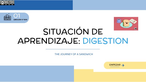 Esta situación de aprendizaje se desarrolla para una clase de 3º ESO, en el área de Biología (bilingüe), trabajando el tema 3 (Aparato Digestivo) durante 6 sesiones. El objetivo es que sean ellos mismos capaces de explicar con sus palabras el proceso digestivo, a través de un cómic desarrollado por canva, trabajando en grupos. Para llegar a ser capaces de elaborar el reto, irán poco a poco adquiriendo conocimiento a través de vídeos, explicaciones y un breakout diseñado en genially. Por último, para repasar conceptos jugarán en grupo a un pasapalabra elaborado con presentaciones de Google, y realizarán un quizziz final.