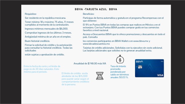 Beneficios: Participas de forma automática y gratuita en el programa Recompensas con el que obtienes: El 9% en Puntos BBVA en todas las compras que realices en México y en el extranjero. Con tus Puntos BBVA puedes comprar gratis en tus comercios favoritos a nivel nacional. Acceso a Descuentos BBVA que te ofrece promociones y descuentos en todo el país. Consulta los comercios participantes en BBVA Wallet o en www.bbva.mx y www.bbvadescuentos.mx Tarjetas de crédito adicionales. Solicítalas con tu ejecutivo sin costo adicional. Las tarjetas adicionales que solicites no te generan anualidad extra.