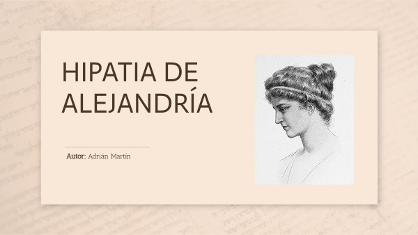 -Nace en Alejandría. en el 355 o 370 d.C.-Una de las primeras científicas de la historia. -Fue filósofa, inventora, escritora y maestra neoplatónica. -Perteneció a la Escuela neoplatónica de Alejandría. -Dedicó su vida al conocimiento y estudio de la ciencia. -Era hija del importante matemático de la época, Teón. -Gracias a cartas con uno de sus discípulos conocemos más de su vida. -Mujer influyente en Alejandría, fue vista como una amenaza por el cristianismo -Patriarca de Alejandría fue el instigador de su muerte. -Fue asesinada de una manera muy cruel por un grupo de cristianos radicales. -Fue olvidada tras su muerte durante varios siglos.