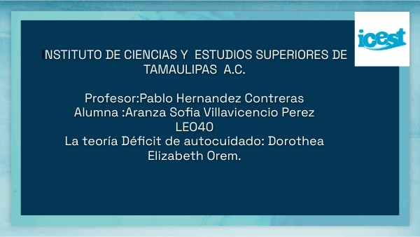 INSTITUTO DE CIENCIAS Y ESTUDIOS SUPERIORES DE TAMAULIPAS A.C. Profesor:Pablo Hernandez Contreras Alumna :Aranza Sofia Villavicencio Perez LEO40 La teoría Déficit de autocuidado: Dorothea Elizabeth Orem.