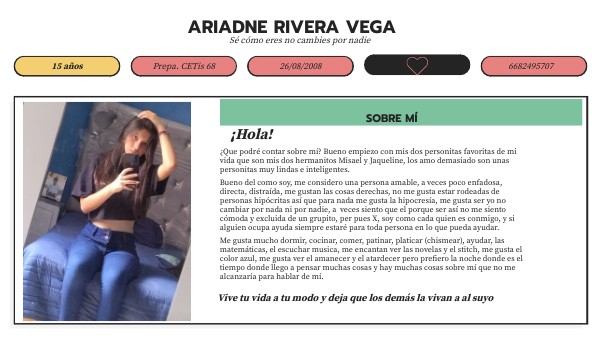 ¿Que podré contar sobre mí? Bueno empiezo con mis dos personitas favoritas de mi vida que son mis dos hermanitos Misael y Jaqueline, los amo demasiado son unas personitas muy lindas e inteligentes. Bueno del como soy, me considero una persona amable, a veces poco enfadosa, directa, distraída, me gustan las cosas derechas, no me gusta estar rodeadas de personas hipócritas así que para nada me gusta la hipocresía, me gusta ser yo no cambiar por nada ni por nadie, a veces siento que el porque ser así no me siento cómoda y excluida de un grupito, per pues X, soy como cada quien es conmigo, y si alguien ocupa ayuda siempre estaré para toda persona en lo que pueda ayudar. Me gusta mucho dormir, cocinar, comer, patinar, platicar (chismear), ayudar, las matemáticas, el escuchar musica, me encantan ver las novelas y el stitch, me gusta el color azul, me gusta ver el amanecer y el atardecer pero prefiero la noche donde es el tiempo donde llego a pensar muchas cosas y hay muchas cosas sobre mí que no me alcanzaría para hablar de mí.