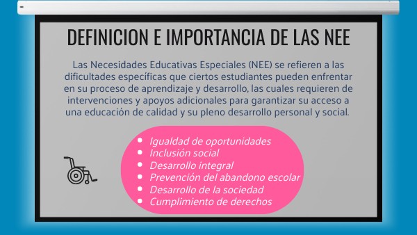 Las Necesidades Educativas Especiales (NEE) se refieren a las dificultades específicas que ciertos estudiantes pueden enfrentar en su proceso de aprendizaje y desarrollo, las cuales requieren de intervenciones y apoyos adicionales para garantizar su acceso a una educación de calidad y su pleno desarrollo personal y social.