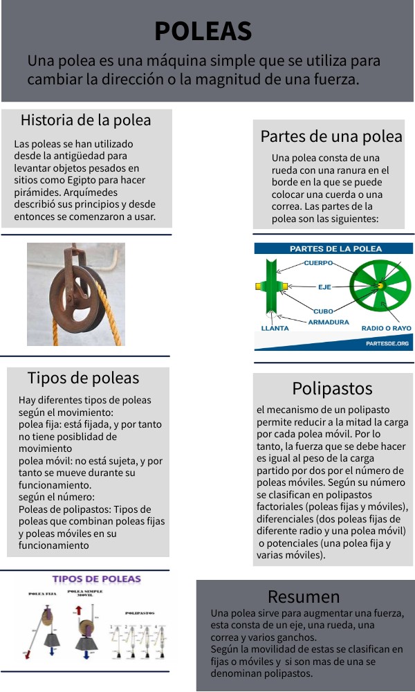 Una polea sirve para augmentar una fuerza, esta consta de un eje, una rueda, una correa y varios ganchos. Según la movilidad de estas se clasifican en fijas o móviles y si son mas de una se denominan polipastos.
