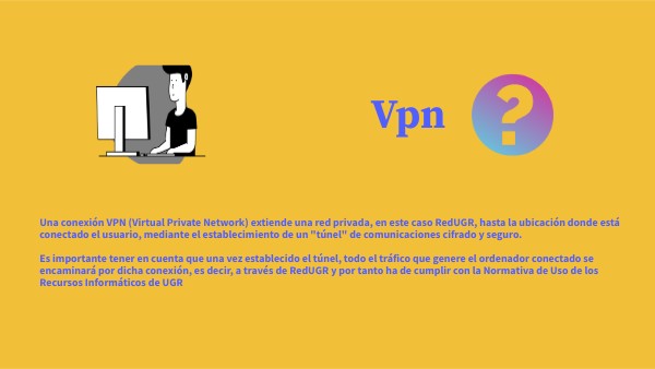 Una conexión VPN (Virtual Private Network) extiende una red privada, en este caso RedUGR, hasta la ubicación donde está conectado el usuario, mediante el establecimiento de un "túnel" de comunicaciones cifrado y seguro. Es importante tener en cuenta que una vez establecido el túnel, todo el tráfico que genere el ordenador conectado se encaminará por dicha conexión, es decir, a través de RedUGR y por tanto ha de cumplir con la Normativa de Uso de los Recursos Informáticos de UGR
