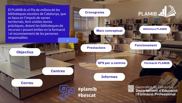 El PLAMIB és el Pla de millora de les biblioteques escolars de Catalunya, que es basa en l’impuls de xarxes territorials, fent visibles bones pràctiques, dotant les biblioteques de recursos i posant èmfasi en la formació i el reconeixement de les persones responsables.