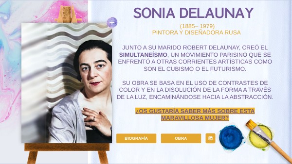 Junto a su marido Robert Delaunay, creó el simultaneísmo, un movimiento PARISINO que se enfrentó a otras corrientes artísticas como son el cubismo o el futurismo. SU OBRA SE BASA EN EL USO DE contrastes de color y EN la disolución de la forma a través de la luz, ENCAMINÁNDOSE hacia la abstracción. ¿OS GUSTARÍA SABER MÁS SOBRE ESTA MARAVILLOSA MUJER?