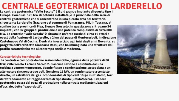 La centrale geotermica “Valle Secolo” è il più grande impianto di questo tipo in Europa. Con quasi 120 MW di potenza installata, è la principale della serie di centrali geotermiche che si concentrano in una piccola area nel territorio circostante Larderello (frazione del comune di Pomarance, PI), in Toscana, al confine tra le province di Pisa, Siena e Grosseto. In questa zona si trovano 34 impianti, con 37 gruppi di produzione e una potenza complessiva di circa 800 MW. La centrale “Valle Secolo” è situata in un'area rurale di circa 10 ettari a ovest della frazione di Larderello, a 2 km dal paese di Montecerboli, in direzione Castelnuovo Val di Cecina. È entrata in esercizio agli inizi degli anni Novanta, su progetto dell’architetto Giancarlo Rossi, che ha immaginato una struttura dal profilo caratteristico ma al contempo snella e moderna.