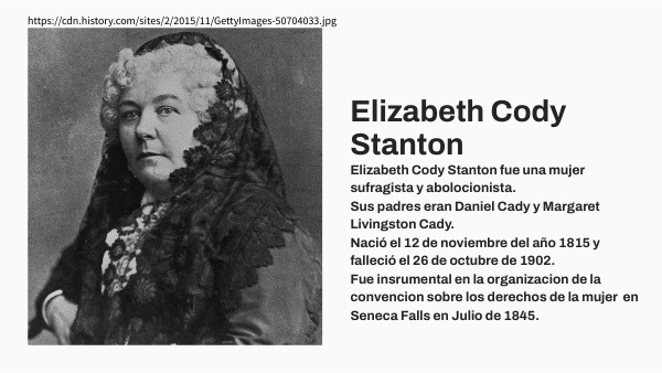 Elizabeth Cody Stanton fue una mujer sufragista y abolocionista. Sus padres eran Daniel Cady y Margaret Livingston Cady. Nació el 12 de noviembre del año 1815 y falleció el 26 de octubre de 1902. Fue insrumental en la organizacion de la convencion sobre los derechos de la mujer en Seneca Falls en Julio de 1845.
