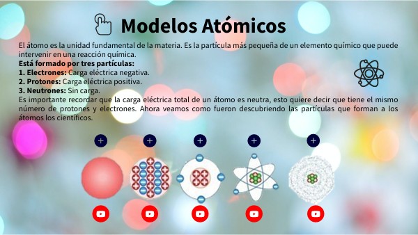El átomo es la unidad fundamental de la materia. Es la partícula más pequeña de un elemento químico que puede intervenir en una reacción química. Está formado por tres partículas: 1. Electrones: Carga eléctrica negativa. 2. Protones: Carga eléctrica positiva. 3. Neutrones: Sin carga. Es importante recordar que la carga eléctrica total de un átomo es neutra, esto quiere decir que tiene el mismo número de protones y electrones. Ahora veamos como fueron descubriendo las partículas que forman a los átomos los científicos.