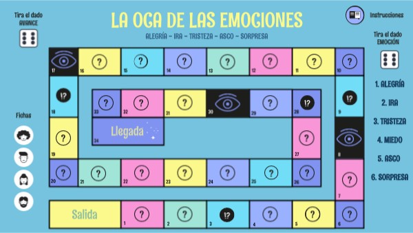 1. Tira el dado EMOCIÓN para saber cual te toca. 2. Tira el dado AVANCE y elige ficha para moverte por el tablero. 3. Cuanddo llegues a una casilla, abre la ventana. 4. Las imágenes de las ventanas pueden (o no) estar relacionadas con la emoción que te ha tocado en el dado. 5. Si la imagen de la ventana coincide con la emoción que te ha tocado en el dado de EMOCIÓN podrás elegir a un compañero para que realice la pregunta o contestarla tú. Pero si no coincide, deberás contestarla tú. 6. Cuando hayas contestado los demás podran también dar sus propias opiniones (si quieren). 7. ¡Disfruta del juego y comparte con tus compañeros tus experiencias y opiniones!