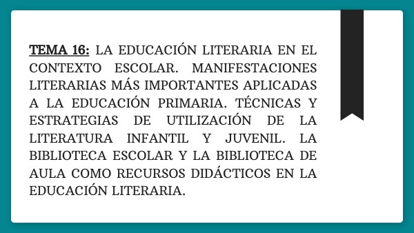 TEMA 16: LA EDUCACIÓN LITERARIA EN EL CONTEXTO ESCOLAR. MANIFESTACIONES LITERARIAS MÁS IMPORTANTES APLICADAS A LA EDUCACIÓN PRIMARIA. TÉCNICAS Y ESTRATEGIAS DE UTILIZACIÓN DE LA LITERATURA INFANTIL Y JUVENIL. LA BIBLIOTECA ESCOLAR Y LA BIBLIOTECA DE AULA COMO RECURSOS DIDÁCTICOS EN LA EDUCACIÓN LITERARIA.