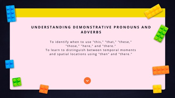 To identify when to use "this," "that," "these," "those," "here," and "there." To learn to distinguish between temporal moments and spatial locations using "then" and "there."