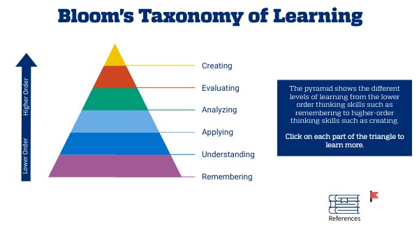 The pyramid shows the different levels of learning from the lower order thinking skills such as remembering to higher-order thinking skills such as creating. Click on each part of the triangle to learn more.