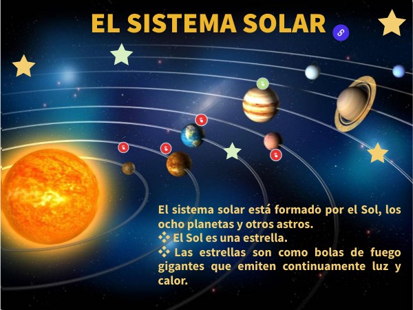 El sistema solar está formado por el Sol, los ocho planetas y otros astros. ❖ El Sol es una estrella. ❖Las estrellas son como bolas de fuego gigantes que emiten continuamente luz y calor.
