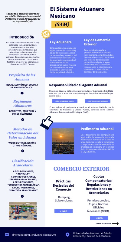 El Sistema Aduanero Mexicano (SAM), entendido como el conjunto de mecanismos, actividades, procedimientos e instancias que determinan la forma en que las mercancías son introducidas o extraídas de nuestro país, se actualizó institucionalmente... con el fin de facilitar y promover las operaciones de comercio. (2012, Torres).
