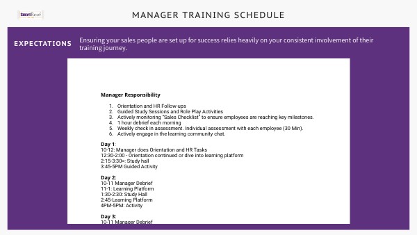 Tactic 7: On-Site Training Days (Specific) Goal: Arrange for reps to spend a day on-site with experienced roofing teams once a month to gain hands-on experience and better understand the roofing process. Measurable: Evaluate reps' understanding through a debrief session at the end of the day. Achievable: Coordinate with roofing teams to schedule non-intrusive observation opportunities. Relevant: Provides practical experience that complements theoretical knowledge. Time-bound: Begin the on-site training days within the first 60 days post-training, continuing monthly.