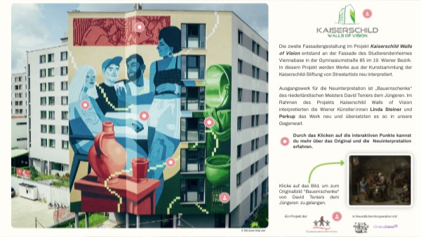 Die zweite Fassadengestaltung im Projekt Kaiserschild Walls of Vision entstand an der Fassade des Studierendenheimes Viennabase in der Gymnasiumstraße 85 im 19. Wiener Bezirk. In diesem Projekt werden Werke aus der Kunstsammlung der Kaiserschild-Stiftung von Streetartists neu interpretiert. Ausgangswerk für die Neuinterpretation ist „Bauernschenke“ des niederländischen Meisters David Teniers dem Jüngeren. Im Rahmen des Projekts Kaiserschild Walls of Vision interpretierten die Wiener Künstler:innen Linda Steiner und Perkup das Werk neu und übersetzten es so in unsere Gegenwart.