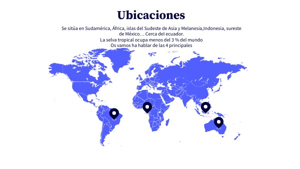 Se sitúa en Sudamérica, África, islas del Sudeste de Asia y Melanesia,Indonesia, sureste de México… Cerca del ecuador. La selva tropical ocupa menos del 3 % del mundo Os vamos ha hablar de las 4 principales