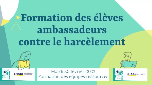 Les objectifs de la formation d'aujourd'hui sont : - comprendre le phénomène de harcèlement, - repérer les comportements pouvant entrainer des situations de harcèlement, - connaitre les postures à adopter en tant qu'ambassadeur - prendre conscience du processus de signalement du protocole PHARE - réflechir aux propositions d'action de prévention - construire le projet pour le lycée à la rentrée