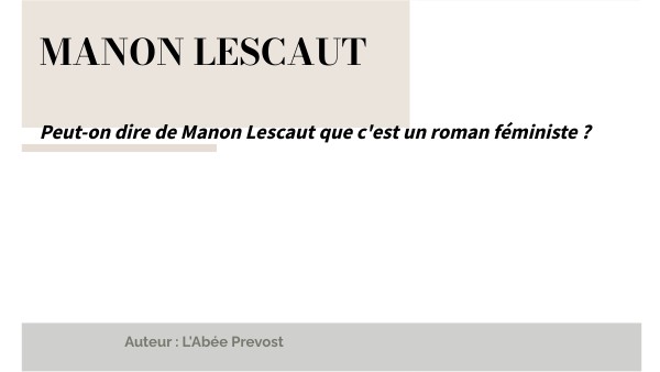 Le roman "Manon Lescaut", écrit par l'Abbé Prévost au XVIIIe siècle, suscite depuis sa publication un vif débat quant à sa représentation des femmes et à son engagement féministe. Ce roman offre un regard saisissant sur la condition des femmes dans une époque marquée par des normes sociales rigides et une hiérarchie patriarcale. Manon Lescaut est une jeune femme indépendante et séduisante, en proie aux forces contradictoires de son époque. Dans cette dissertation nous proposons d'analyser en quoi "Manon Lescaut" peut être considéré comme un roman féministe car en effet, l'héroïne incarne à la fois les contraintes sociales imposées aux femmes de son époque et leurs aspirations individuelles à l'autonomie et à la liberté. Ainsi le côté sexiste du roman sur les désirs individuels , les privilèges hommes/femmes et la fragilité de la femme qui traversent le récit.