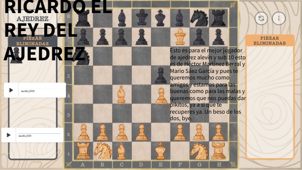 Esto es para el mejor jugador de ajedrez alevin y sub 10 esto es de Héctor Martínez Berzal y Mario Sáez García y pues te queremos mucho como amigos y estamos para las buenas como para las malas y queremos que nos puedas dar pikitos, ya a si que te recuperes ya. Un beso de los dos, bye.