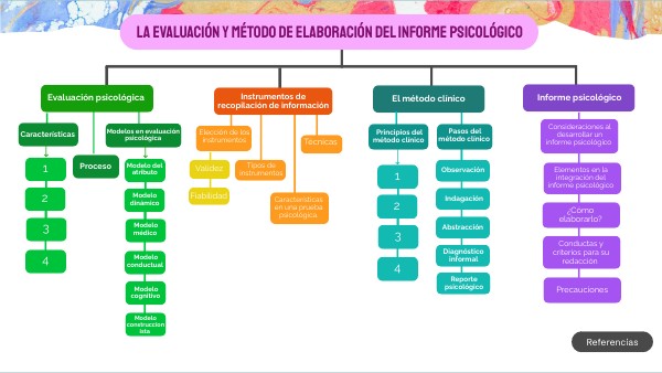 Cattaneo, B. H. (2007). Informe psicológico: elaboración y características en diferentes ámbitos. Tercera edición: (ed.). Eudeba. https://elibro.net/es/lc/bibliotecauveg/titulos/66180 Díaz, L. (2011). Procedimiento y proceso del método clínico. Facultad de psicología UNAM. https://www.psicologia.unam.mx/documentos/pdf/publicaciones/Procedimiento_y_Proceso_del_Metodo_Clinico_Lidia_Diaz_Sanjuan_TAD_3_Sem.pdf Fernández-Ballesteros, R. (2015). Evaluación psicológica: conceptos, métodos y estudio de casos: (2 ed.). Difusora Larousse - Ediciones Pirámide. https://elibro.net/es/lc/bibliotecauveg/titulos/49032 UVEG. (s.f.). Lección 1. Los primeros pasos hacia el informe psicológico. En Integración del reporte psicológico. [Módulo en línea]. Universidad Virtual del Estado de Guanajuato. https://avalicmod19c.uveg.edu.mx/mod/scorm/player.php?a=5757¤torg=Leccion1_IRP_v02_ORG&scoid=12332 UVEG. (s.f.). Lección 2. Elementos de soporte del informe psicológico. En Integración del reporte psicológico. [Módulo en línea]. Universidad Virtual del Estado de Guanajuato.