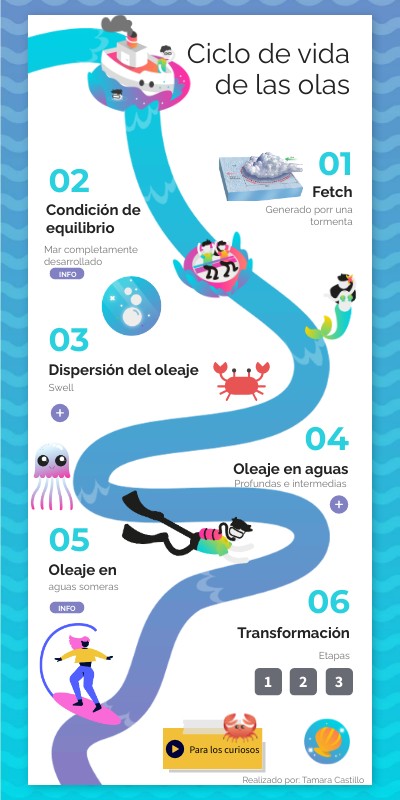 Del fetch salen olas con diferentes longitudes de onda y celeridad. Cerca de este, las olas se encuentran desorganizadas. Sin embargo, al irse alejando, estas comienzan a ordenarse, de manera que las ondas con mayor longitud y celeridad se alejan de las más pequeñas, formando así el Swell o mar de fondo