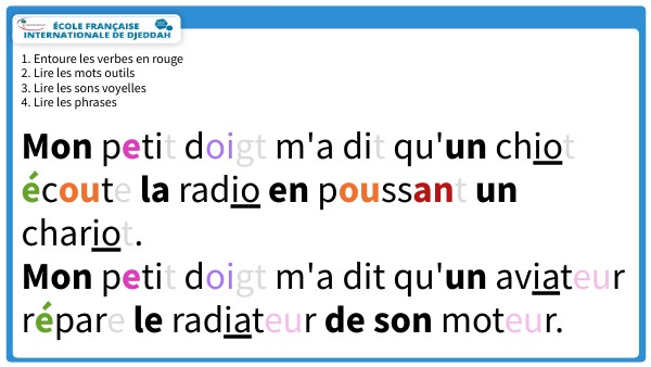 1. Entoure les verbes en rouge 2. Lire les mots outils 3. Lire les sons voyelles 4. Lire les phrases