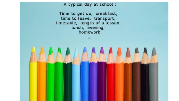 A typical day at school : Time to get up, breakfast, time to leave, transport, timetable, length of a lesson, lunch, evening, homework ...