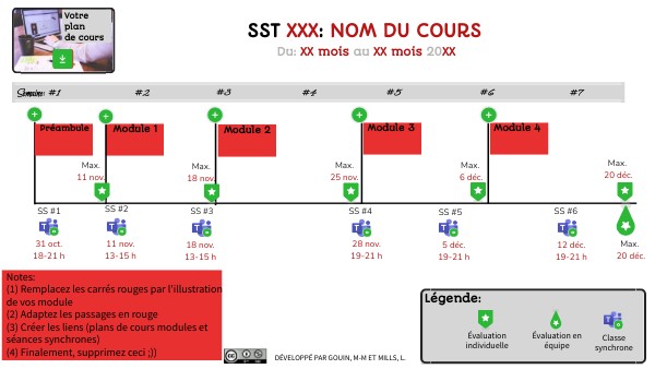 Notes: (1) Remplacez les carrés rouges par l'illustration de vos module (2) Adaptez les passages en rouge (3) Créer les liens (plans de cours modules et séances synchrones) (4) Finalement, supprimez ceci ;))