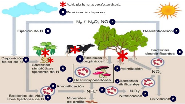 Amonificación:Cuando las plantas y otros organismos mueren los descomponedores descomponen sus restos. En el proceso liberan gas de nitrógeno en forma de iones de amonio, tambíen es provocado por las bacterias fijadoras de vida libre. Amonio:El amoniaco que se encuentra en el suelo se transforma en amonio. Asimilación:La asimilación es el proceso cuando las plantas absorben los nitratos y los utilizan para su desarrollo. Bacterias desnitrificante:Las bacterias desnitrificantes son microorganismos que participan en el proceso de desnitrificación, una etapa crucial del ciclo del nitrógeno. Bacterias de vida libre fijadoras de nitrógeno:Funcionan de manera independiente y no necesitan una relación simbiótica específica con las plantas para llevar a cabo la fijación del nitrógeno. Bacterias simbioticas fijadoras de nitrógeno:Algunas plantas establecen asociaciones simbióticas con bacterias fijadoras de nitrógeno, como las leguminosas (guisantes, alfalfa, etc.). Estas bacterias forman nódulos en las raíces de las plantas y convierten el N₂ en formas que las plantas pueden absorber. Deposicion física de nitrógeno:Una de las formas para que el suelo se enriquece con nitrógeno es con las precipitaciones o las descargas eléctricas que suceden en la atmósfera. Descomponedores:Los descomponedores son organismos, principalmente bacterias y hongos, su papel en el ciclo del nitrógeno es liberar el nitrógeno contenido en los residuos orgánicos. Desnitrificación:La desnitrificación es la conversión de nitratos (NO₃⁻) o nitritos (NO₂⁻) en nitrógeno gaseoso (N₂) u otros compuestos nitrogenados, liberando nitrógeno de nuevo a la atmósfera. La fijación del nitrógeno:Es un proceso fundamental del ciclo del hidrógeno,pasa cuando algunos microorganismos como las bacterias convierten el nitrógeno que esta almacenado en la atmósfera en una forma que las plantas puedan utilizar. Nitrógeno en la atmósfera:Todo empieza con el nitrogeno que esta almacenado en la atmósfera, se encuentra en forma molecular y en una proporcion del 78%.Las plantas no pueden absorberlo directamente cuando se encuentra en esa forma. Nitrificación:La nitrificación es una etapa importante en el ciclo del nitrógeno en los suelos provocada por la oxidación biológica de amonio con oxígeno en nitrito, seguido por la oxidación de esos nitritos en nitratos. Lixiviación:Se produce cuando la parte móvil de la reserva de nitrógeno mineral (nitrato) es arrastrado fuera de la zona de las raíces a causa de la lluvia intensa o un riesgo excesivo.