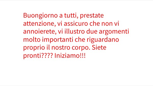 Buongiorno a tutti, prestate attenzione, vi assicuro che non vi annoierete, vi illustro due argomenti molto importanti che riguardano proprio il nostro corpo. Siete pronti???? Iniziamo!!!