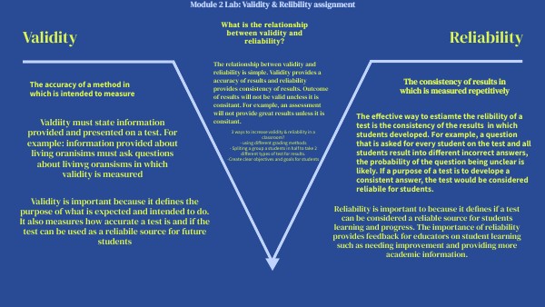 The relationship betwen validity and reliability is simple. Validity provides a accuracy of results and reliability provides consistency of results. Outcome of results will not be valid uncless it is consitant. For example, an assessment will not provide great results unless it is consitant.