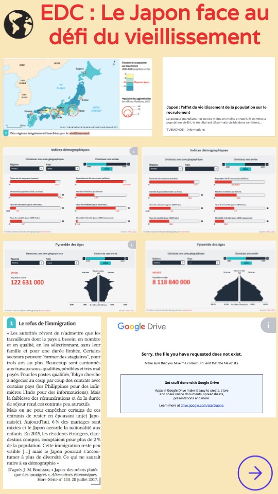 Consignes : Vous êtes un journaliste qui visite le Japon en 2024. Rédigez un article de presse en vous basant sur les documents de la page précédente. Vous devez montrer quel est l'impact du vieillissement de la population sur la société japonaise. Votre article doit respecter la forme attendue, à savoir : - Un titre. - Un chapeau (il résume en quelques mots le propos de l'article). - Au moins deux paragraphes (maximum trois) comportant un sous-titre (le titre du paragraphe) et une attaque (une accroche). - Une chute (une conclusion). - Bonus : éventuellement une ou deux illustrations pertinentes avec une légende pour les décrire et citer la source (d'où vient l'illustration, qui l'a faite, quand, etc.). Aide pour cibler l'étude des documents : Votre article doit montrer l'état de la population au Japon aujourd'hui, comment elle a évolué à travers le temps et quelles sont les conséquences du vieillissement de la population sur la société japonaise. Prenez des notes au brouillon des différents documents (des chiffres par exemple) en ayant en tête ces idées avant de vous mettre à rédiger votre article.
