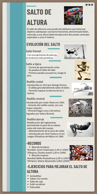 El salto de altura es una prueba de atletismo que tiene por objetivo sobrepasar una barra horizontal, denominada listón, colocada a una altura determinada entre dos postes verticales separados a unos 4 metros.