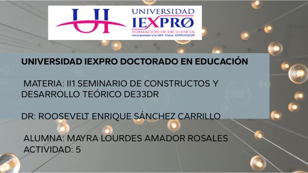 UNIVERSIDAD IEXPRO DOCTORADO EN EDUCACIÓN MATERIA: II1 SEMINARIO DE CONSTRUCTOS Y DESARROLLO TEÓRICO DE33DR DR: ROOSEVELT ENRIQUE SÁNCHEZ CARRILLO ALUMNA: MAYRA LOURDES AMADOR ROSALES ACTIVIDAD: 5