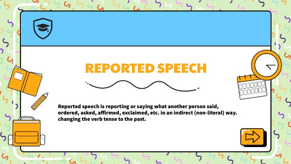 Reported speech is reporting or saying what another person said, ordered, asked, affirmed, exclaimed, etc. in an indirect (non-literal) way. changing the verb tense to the past.