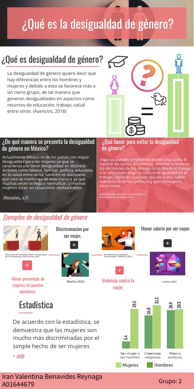 Asencios, R. (2018). Glosario de términos relacionados al enfoque de igualdad de género. Refworld. https://www.refworld.org/es/ref/themreport/stc/2018/es/127606 Desigualdad en cifras. (2019). Instituto Nacional de las Mujeres. http://cedoc.inmujeres.gob.mx/documentos_download/BoletinN3_2019.pdf Discriminación salarial de género: la importancia de la transparencia. (2019). Educando en Igualdad. https://www.educandoenigualdad.com/2019/09/27/discriminacion-salarial-de-genero-la-importancia-de-la-transparencia/ Doce pequeñas acciones con gran impacto para Generación Igualdad. (2020). ONU Mujeres. https://www.unwomen.org/es/news/stories/2020/2/compilation-small-actions-big-impact-for-generation-equality Eliminación de la violencia contra mujeres - IDEHPUCP. (2021). IDEHPUCP. https://idehpucp.pucp.edu.pe/editorial/editorial-eliminacion-de-la-violencia-contra-mujeres/ Lozsan, N. (2022). Desigualdad Salarial » Qué es, Causas, Efectos y Cifras. Cinco noticias. https://www.cinconoticias.com/desigualdad-salarial/ Macho, M. (2021). Yo no me siento discriminada. Mujeres con ciencia. https://mujeresconciencia.com/2021/06/23/yo-no-me-siento-discriminada/ Rosales, A. (S.f). Desigualdad de Género en México. Observatori Solidaritat. https://observatori.org/mexic/desigualdad-de-genero-en-mexico/