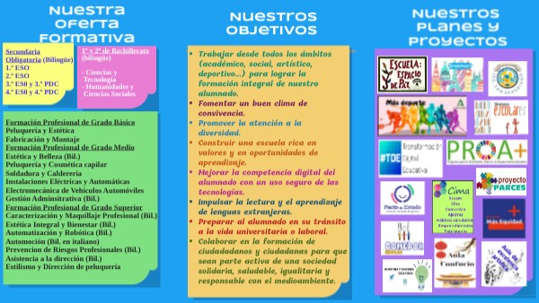 Formación Profesional de Grado Básico Peluquería y Estética Fabricación y Montaje Formación Profesional de Grado Medio Estética y Belleza (Bil.) Peluquería y Cosmética capilar Soldadura y Calderería Instalaciones Eléctricas y Automáticas Electromecánica de Vehículos Automóviles Gestión Adminsitrativa (Bil.) Formación Profesional de Grado Superior Caracterización y Maquillaje Profesional (Bil.) Estética Integral y Bienestar (Bil.) Automatización y Robótica (Bil.) Automoción (Bil. en italiano) Prevencion de Riesgos Profesionales (Bil.) Asistencia a la dirección (Bil.) Estilismo y Dirección de peluquería