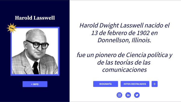 Harold Dwight Lasswell nacido el 13 de febrero de 1902 en Donnellson, Illinois. fue un pionero de Ciencia política y de las teorías de las comunicaciones