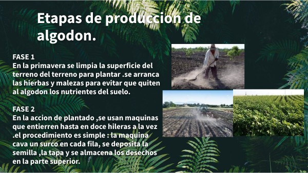 FASE 1 En la primavera se limpia la superficie del terreno del terreno para plantar .se arranca las hierbas y malezas para evitar que quiten al algodon los nutrientes del suelo. FASE 2 En la accion de plantado ,se usan maquinas que entierren hasta en doce hileras a la vez .el procedimiento es simple : la maquina cava un surco en cada fila, se deposita la semilla ,la tapa y se almacena los desechos en la parte superior.